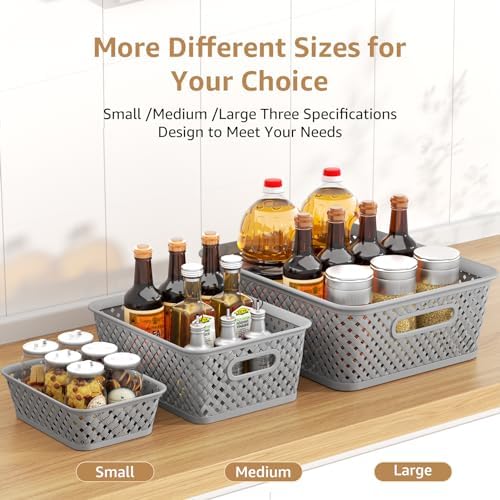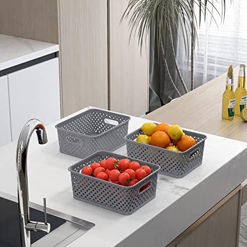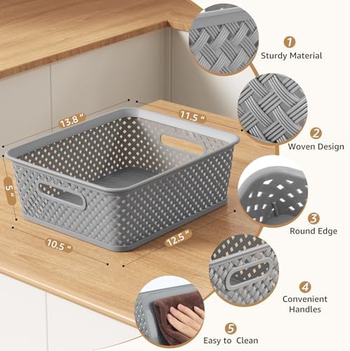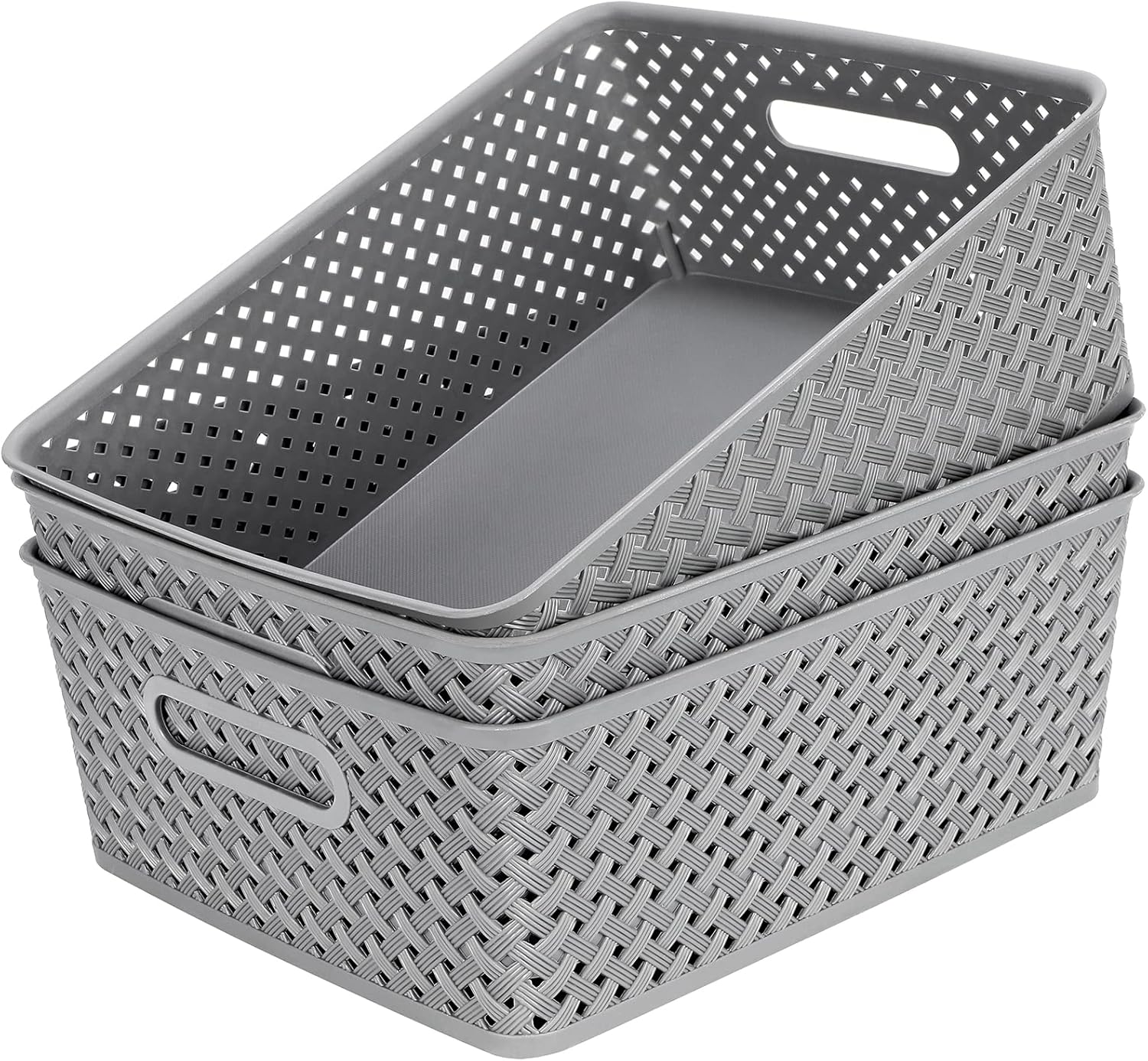 MaxGear Organization and Storage 3 Packs, Plastic Bins Organizer Bins, Woven Baskets for Storage, Plastic Baskets with Handles, Grey Basket for Organizing, Basket Organizer for Home and Office, Large